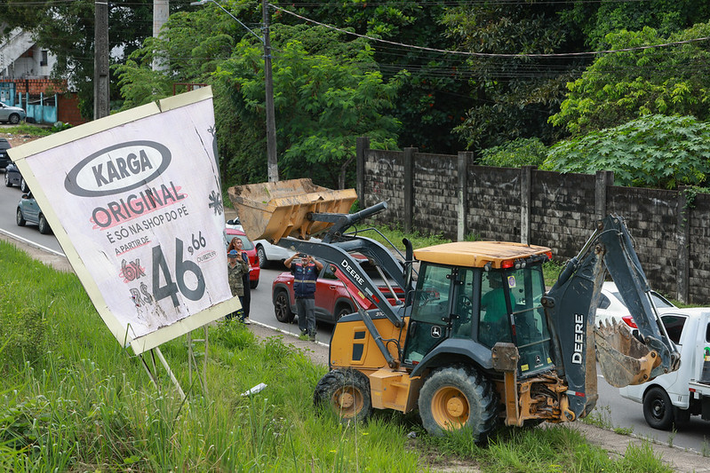 A Prefeitura de Manaus realizou, nesta quarta-feira (4/2), a demolição administrativa de três outdoors instalados de forma irregular em área pública da avenida Governador José Lindoso, no bairro Aleixo, zona Centro-Sul da capital. A operação foi coordenada pelo Instituto Municipal de Planejamento Urbano (Implurb), com apoio da Guarda Municipal, da Secretaria Municipal de Segurança Pública e Defesa Social (Semseg), do IMMU e da Seminf.